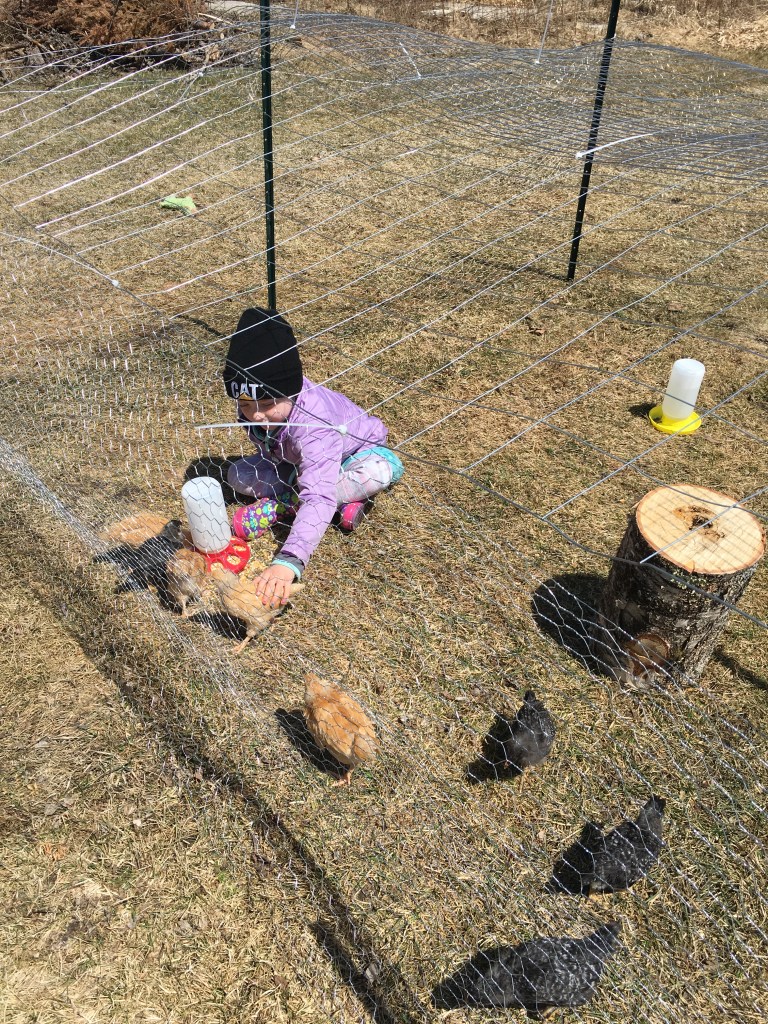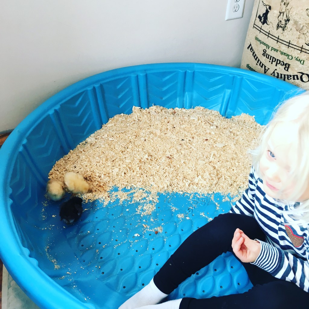 When it came time to clean their bin we would put them in a kiddie pool with fencing around it and let them run and play. My two older girls were younger at the the time and would sit in the pool and play with the chicks. Then we would scoop out the bin and add in fresh shavings.
