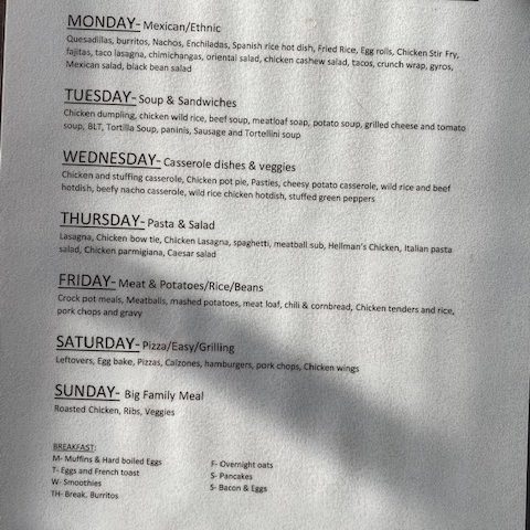 Below is a picture of the menu planner I follow. Since I enjoy cooking, I found this helpful in keeping things interesting and fun.